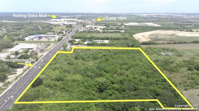 Commercial Gem located in a vastly growing area of the city located 1 mile inside Hwy Loop 1604! Highly valued commercially zoned C-3 & R-6 lot, 8.6 ac, located directly off the frontage of Nacogdoches near the intersection of Toepperwein. The area is filled with urban developments and establishments near by including the fast growth of the Live Oak Area. IKEA, Randolph Air Force Base, Rolling Oaks Mall, Stone Oak, all within a 10minute proximity. Own your own land or build to suit, the choice is yours!