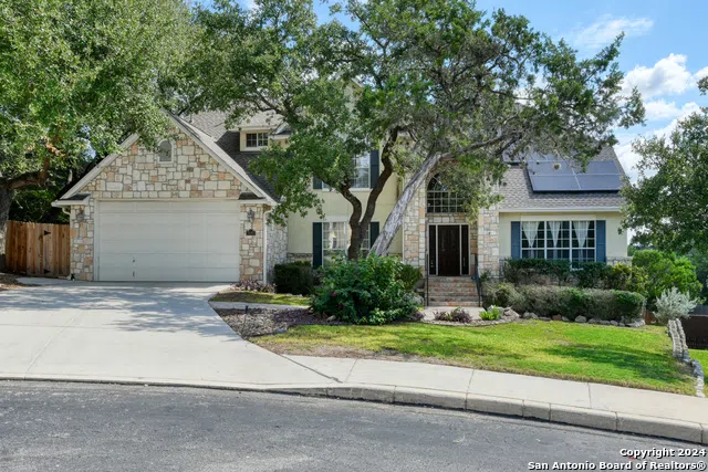 Welcome to this 4-bedroom, 4.5-bathroom home, perfectly situated in a cul-de-sac within the highly sought-after gated community of Rogers Ranch. This impressive two-story residence boasts a spacious primary bedroom suite on the main level, with a garden tub with jets, a walk-in shower, a double vanity, and a spacious walk-in closet. A second primary bedroom on the main floor offers a full bath with wheelchair access shower. The gourmet kitchen is a chef's delight, featuring a kitchen island, solid countertops, built-in double ovens, a microwave, and ample counter space & breakfast room. The refrigerator, purchased in June 2024, and the dishwasher (2022) are included, with the refrigerator being tied into a reverse osmosis system for purified water. The cooktop was recently upgraded in 2024. The large living room, with its stone gas fireplace, and a unique crafters' dream closet under the stairs, add to the home's charm. The downstairs study, with its bamboo wood laminate floors and abundant natural light from large windows, offers a tranquil workspace. Upstairs, the spacious game room, currently equipped with a pool table and accessories, features a wet bar ideal for entertaining. Adjacent, the large office/library includes built-in wooden cabinets and a corner desk, with two personal file cabinets also conveying with the property. Two additional bedrooms upstairs include one with a walk-in closet and a full bath. Step outside to the elevated, somewhat wrap-around deck, which features a built-in gas Bull grill and a super burner, perfect for outdoor gatherings. The property also includes three attic spaces for extra storage and a 2-car garage with higher-than-standard ceiling height to accommodate taller vehicles. Recent updates include two dedicated A/C units replaced in 2021, solar panels installed in 2021, leafless gutters, and a partial sprinkler system. The washer and dryer are also included. Enjoy peace of mind with a guard stationed at the community entrance during evening hours. This exceptional home offers both luxury and practicality, making it a perfect choice for your next move.Neighborhood amenities: Located just on the north side of 1604 in between I10 and 281 (perfect location for JBSA or downtown SA work). Montessori school within walking distance. Coveted Reagan High School within four miles drive. Golds gym within short walking distance. Community pool, basketball court and tennis/pickleball court less than 100 yards from the house. Fiesta Texas Six Flags, The Rim and La Cantera merely 8-10-minute drive. HEB only a three-minute drive.