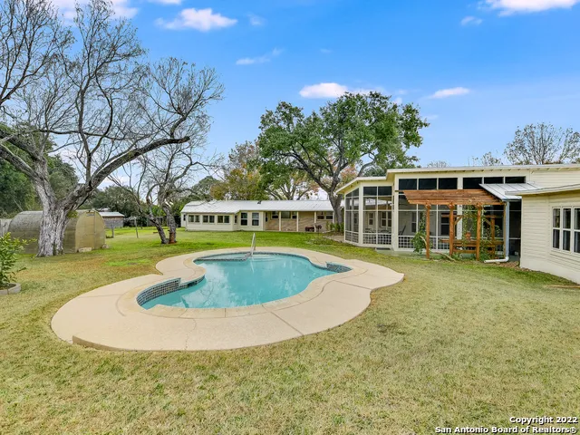 This lush and expansive acre plus, corner lot in Alamo Heights ISD is the host to a single story, 4 bedroom, 3 full bath, 3 car garage home that is ready to welcome its new owners! You'll enjoy spending time relaxing in the sparkling pool in your private, fenced back yard. This lot has olive trees, pear trees and other fruit bearing trees as well as a green-house, storage shed and an open carport. Inside you have an inviting foyer with a glass block wall, an open and spacious kitchen with 2 cooking spaces that overlooks the back yard along with a very generous screened, covered porch. There's 2 fireplaces, 100k worth of sound-proof windows and a gorgeous metal roof that was installed a year ago! For energy efficiency and low utility costs, the home has a Movato heating system with 2 zones that overlap in the kitchen, fossil rock, soundproof windows, cool roof and the well is approved for agricultural usage. The lot can be divided by 10k sf pieces. Some updating could be done but this home has a custom designer feel, is move in ready and will not disappoint!!