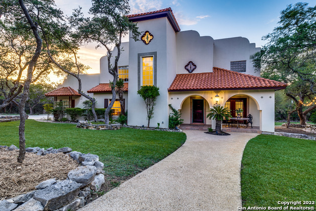 Nestled on 4.4 oak studded acres in the Texas Hill Country, this custom built Spanish Revival retreat offers the discerning buyer a rare opportunity to own a property of architectural interest with spectacular amenities surrounded by nature yet minutes from city life. Prominent arches, decorative tile work, and ornate details grace the main house which features a formal dining room, gourmet kitchen with breakfast area, a light filled living room with a wood burning fireplace, a cozy den including a wet bar, and a first floor guest suite with private outdoor access. The grand bell tower staircase leads you to a luxurious primary suite and two secondary bedrooms. The intimate sitting room in the primary suite features a mosaic tile fireplace and private balcony overlooking the property with long distance hill country views as the backdrop. Perched amongst the trees, the spacious primary bedroom features recent hardwood floors and hand troweled stucco walls along with boutique style walk-in closet featuring a beautiful stained glass window. French doors in the living room open up to sound of the waterfall on the impressive stone plaza built by stonemasons from San Miguel De Allende, a perfect set up for entertaining. A stone pathway leads you to a stunning backyard oasis featuring a glittering lagoon style pool and waterfall alongside an enclosed pool house complete with an 18 ft. bar, massive stone fireplace, meat smoker, and pizza oven allowing for year long entertaining and enjoyment. After a fun day at the pool, head to your guest casita with a full bath for a serene spa like experience. With the additional 850 sqft. of combined living space, this private compound offers fantastic livability and lifestyle options with even more room to build if you desire. Conveniently located along the 281 corridor with easy access to Canyon Lake, The Guadalupe River, Bulverde, and just under 25 minutes to the San Antonio Airport, you will find such a special property hard to come by. Attractive Seller Financing Options Available.