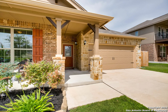 This spacious single-story home features an open concept, grand kitchen design with an oversized island. Additional home features include open floor plan with oversized tile throughout, granite countertops, 8 ft. walk-in shower, and 42 in. kitchen cabinets. Enjoy the outdoors under the covered patio and full yard sprinkler system. Community amenities include pool, walking trails, greenbelt, and playground. Conveniently located just off I-35 in highly sought after Schertz/Cibolo UC ISD. Come check it out for yourself!
